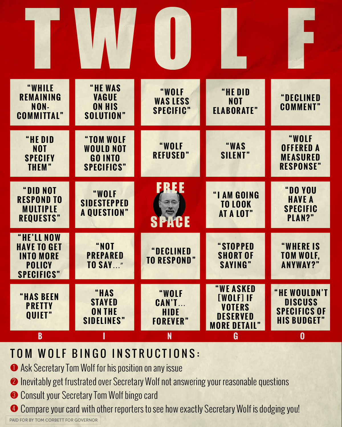 And just in case you missed it, here's the most recent version of our millionaire Secretary Tom Wolf Bingo board that is filled with actual quotes from stories regarding millionaire Secretary Tom Wolf's refusal to be straight with reporters.