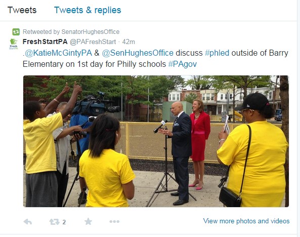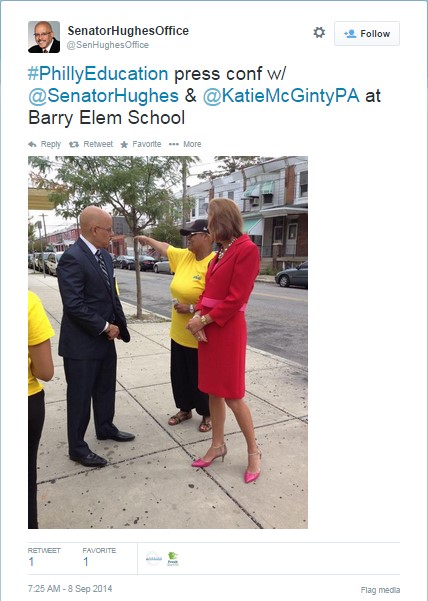 On Monday morning, State Senator Vincent Hughes’s official government office attended and tweeted out a photo of State Senator Hughes attending a campaign press conference hosted by Tom Wolf’s False Start campaign.