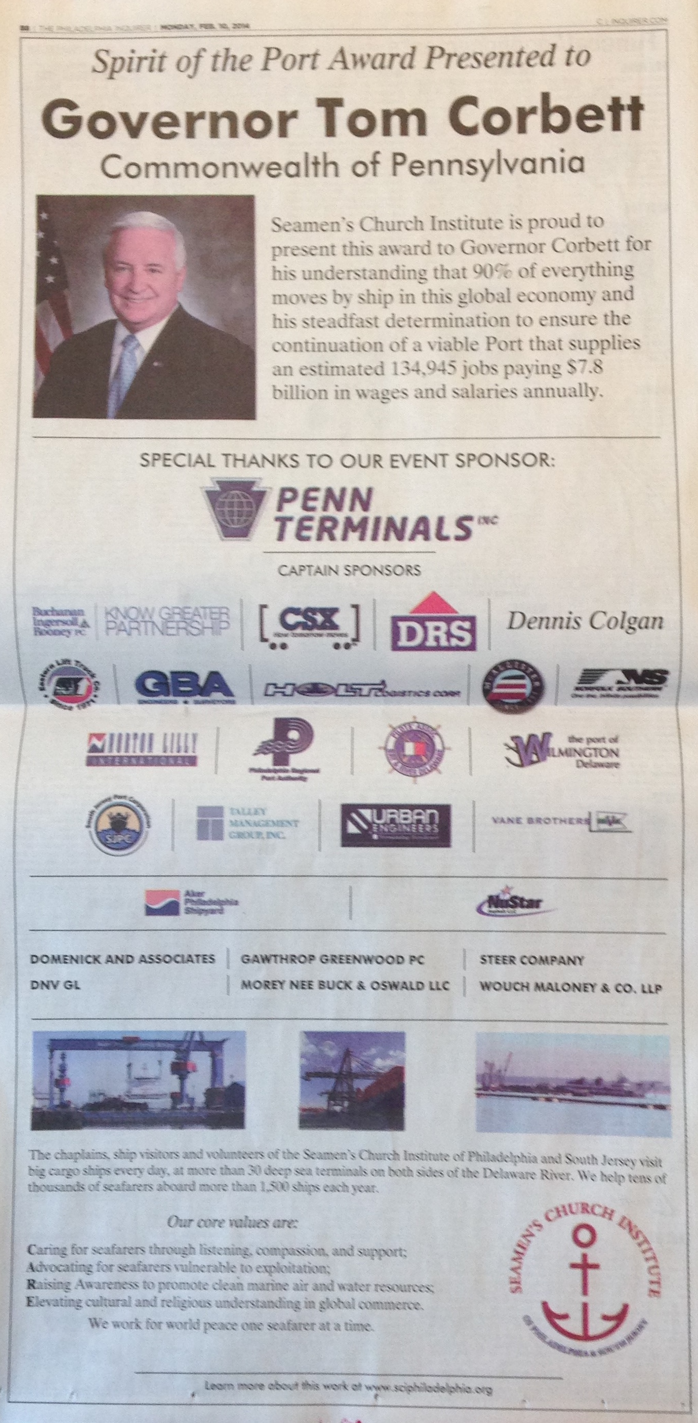 Later this week, the Seamen’s Church Institute of Philadelphia & South Jersey will present the Spirit of the Port Award to Governor Tom Corbett for his commitment to ensuring the Philadelphia port prospers and grows as a viable part of the greater Philadelphia, Pennsylvania and U.S. economy. The Philadelphia port is supporting more than 130,000 jobs paying more than $7.8 billion annually in wages and salaries. The award is accompanied by an announcement recognizing the Governor’s achievement in today’s Philadelphia Inquirer.